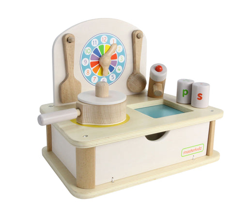 Desktop wooden cooker including a set of stainless steel utensils, a seasoning set, and a clock. Inspire aspiring chefs to create delicious feasts ...