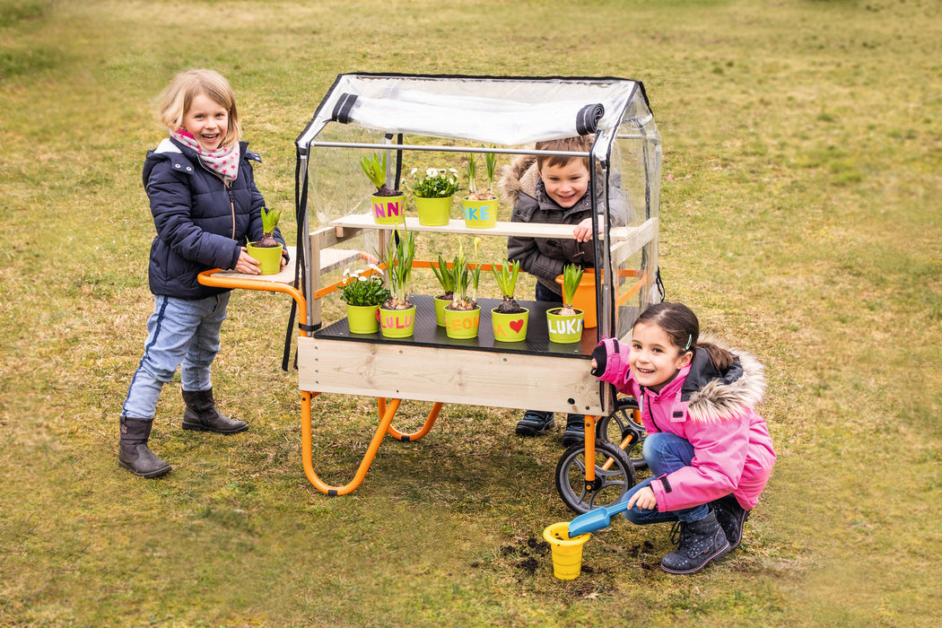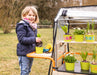 This mobile Greenhouse,is easy to move to the best location for nurturing plants. Built on a sturdy steel frame with wooden shelves, the platform is covered with a transparent cover which unzips for access and provides shelter for the young plants. An extra mini potting bench is also provided at the handle end of the unit. Perfect for Children who love gardening, and growing plants. Teaches children about lifecycles, and how to nurture vegetables and other plants. Children love watching things grow especially if they have planted the seeds themselves.